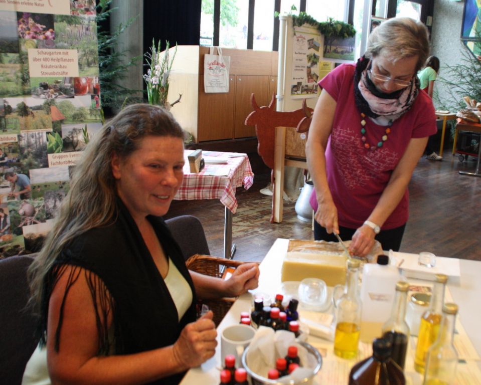 Rems Zeitung vom 28. August 2014 Rezept für die kleine Wiesensalbe: Christine Pommerer bot am Treffpunkt BW im Stadtgarten das Herstellen von Kräutersalben an